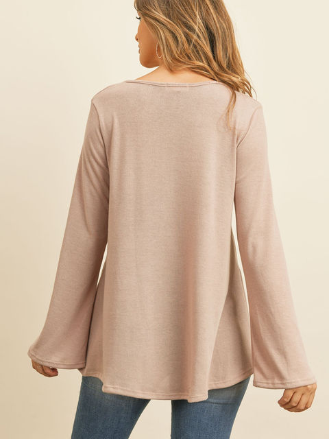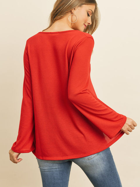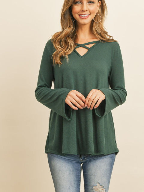 A classic solid print adorns this soft detailed top. Featuring a criss-cross neckline, bell sleeves with bell trim, and a relaxed bodice. Pair with skinny jeans and mules when it's warm, and then add a cardigan and switch to knee-high boots when cool weather rolls in.