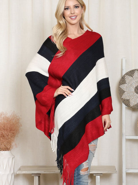 Hdf2099 - Color Block Fringe Poncho