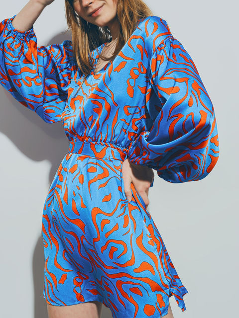Length: Mini length. Subcategory: Dress. Collar: V-neck neckline. Sleeves: Puff sleeves. Print: Animal print. Fit: Standard fit. Style: Daily. Detail: Belt of same fabric included. Fabric: Satin . Seam: Elasticated sleeves. Waist: Elastic waist. runs true to size. S.
