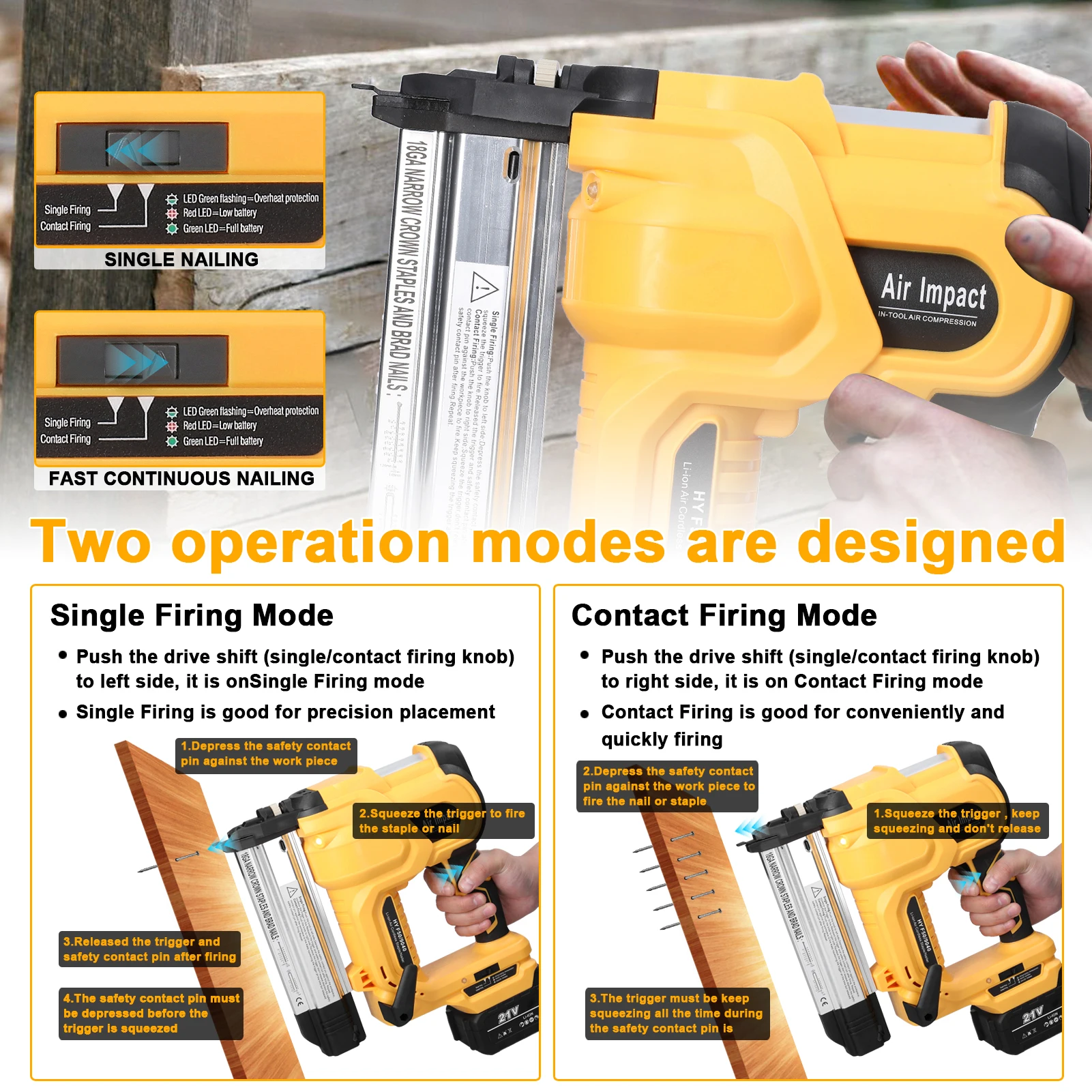Two operation modes are designed, to support both single nailing and fast continuous nailing, you can adjust according to your requirements.