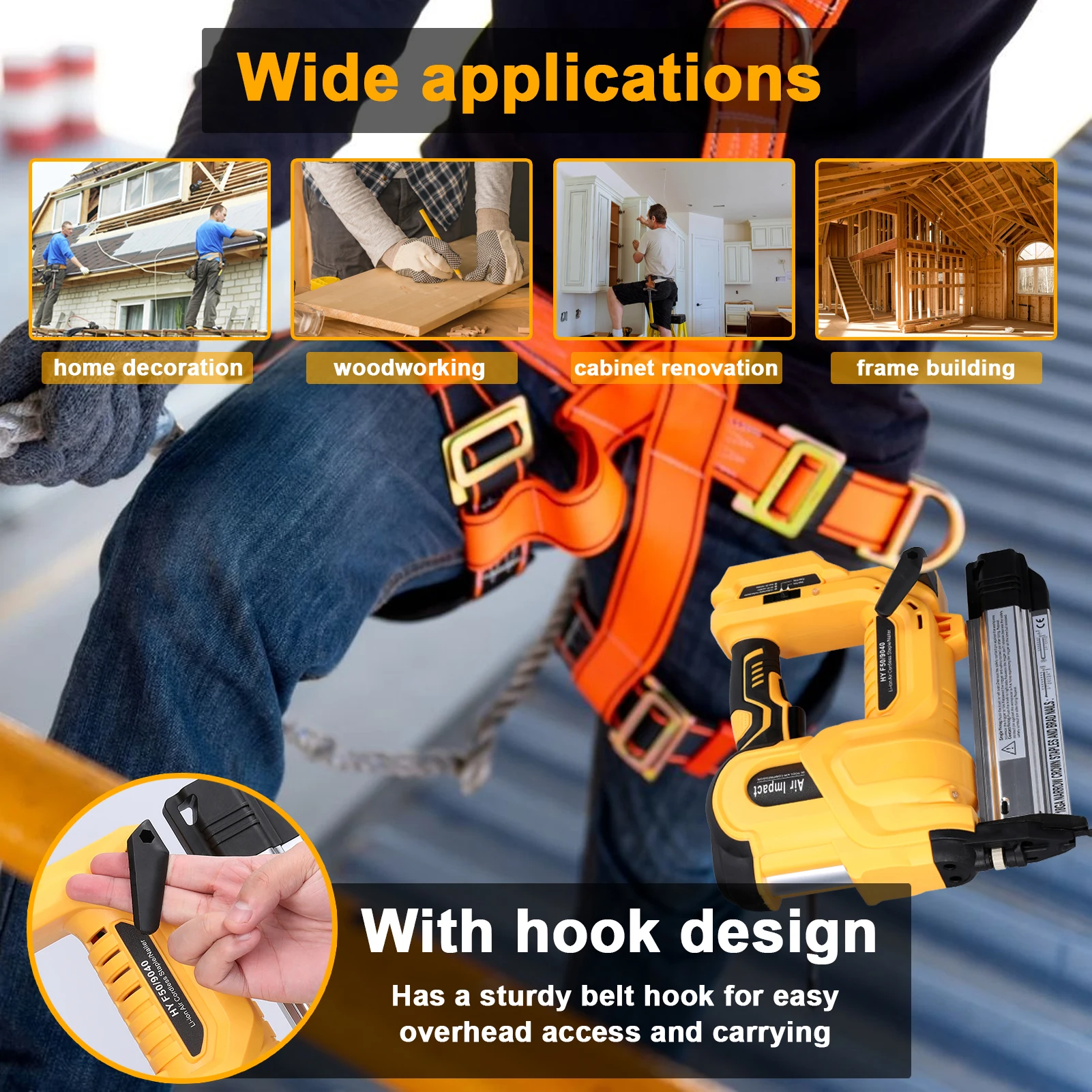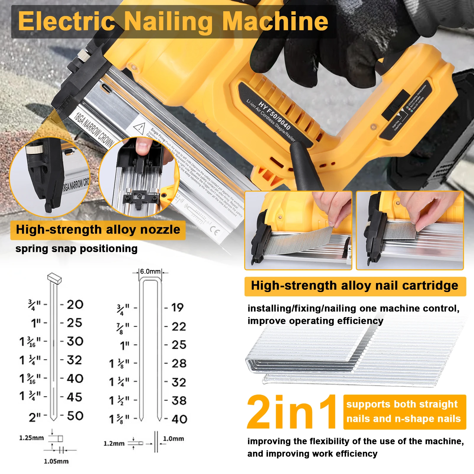 This nailing machine is easy to use, and supports both straight nails and n-shape nails, improving the flexibility of the use of the machine, and improving work efficiency. High-power copper wire motor, with surging power and strong penetration, fast continuous nailing, and long motor lifespan. High-strength alloy nozzle and nail cartridge, spring snap positioning, installation/fixing/nailing one machine control, improve operating efficiency. Suitable for home decoration, waterpipe installation, woodworking, cabinet renovation, ceiling fixing, frame building, and so on.