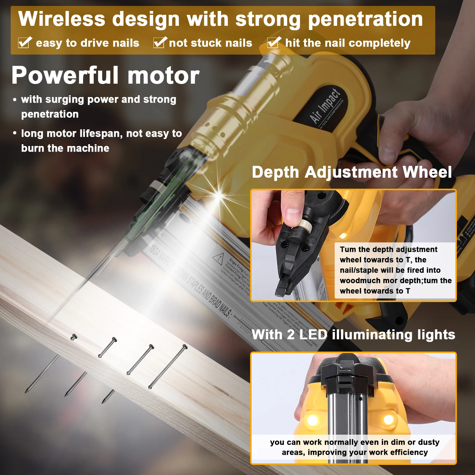 Wireless design with strong penetration, one button out of the nail, easy to drive nails, not stuck nails, hit the nail completely, easy to penetrate a variety of hardwood.